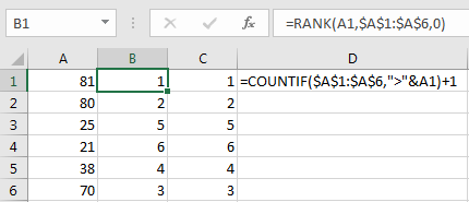 =COUNTIF($D$2:$D$15,”>”&D2)+COUNTIF($D$2:D2,D2)