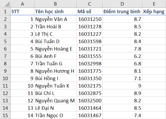 Chúng ta sẽ bắt đầu xây dựng bảng tính, cụ thể trong trường hợp này là xếp hạng điểm trung bình. Tùy từng trường sẽ có những thông tin riêng, tuy vậy vẫn sẽ có những tiêu đề cột chung sau đây: