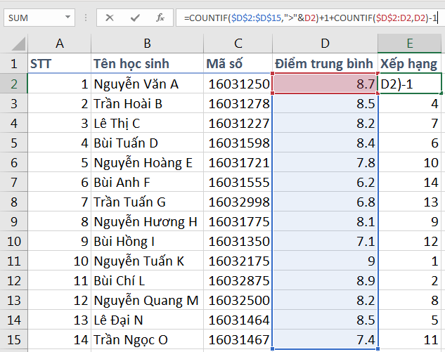 Hàm COUNTIF trong trường hợp này sẽ đếm những điểm số lớn hơn điểm số của từng học sinh, sau đó cộng với 1 để ra được xếp hạng. Ví dụ, học sinh thứ nhất có điểm cao nhất, hàm COUNTIF trả kết quả là 0, sau đó cộng với 1 thành xếp hạng 1.